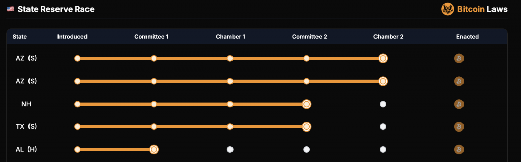 Le prochain type d’acteurs qui pourrait être un acheteur de BTC à grande échelle sont les états américains. Le site Bitcoin Laws recense l’évolution de cette course à l’adoption des lois sur l’établissement pour une réserve de BTC.