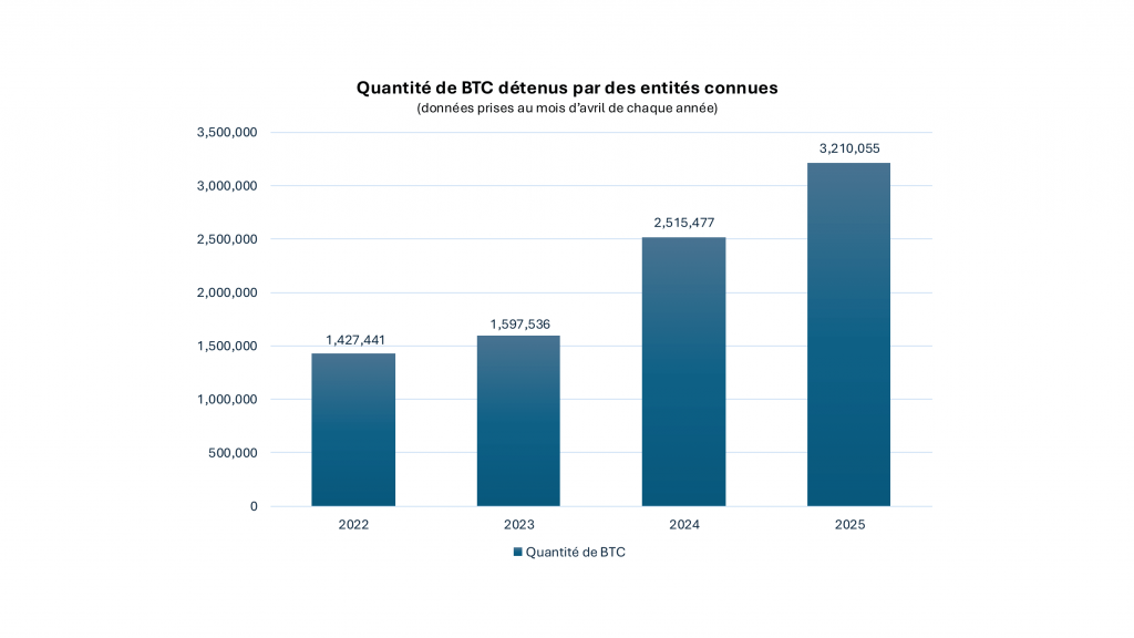 D’après les données de Bitcointreasuries.net, la détention de Bitcoin augmente chaque année.