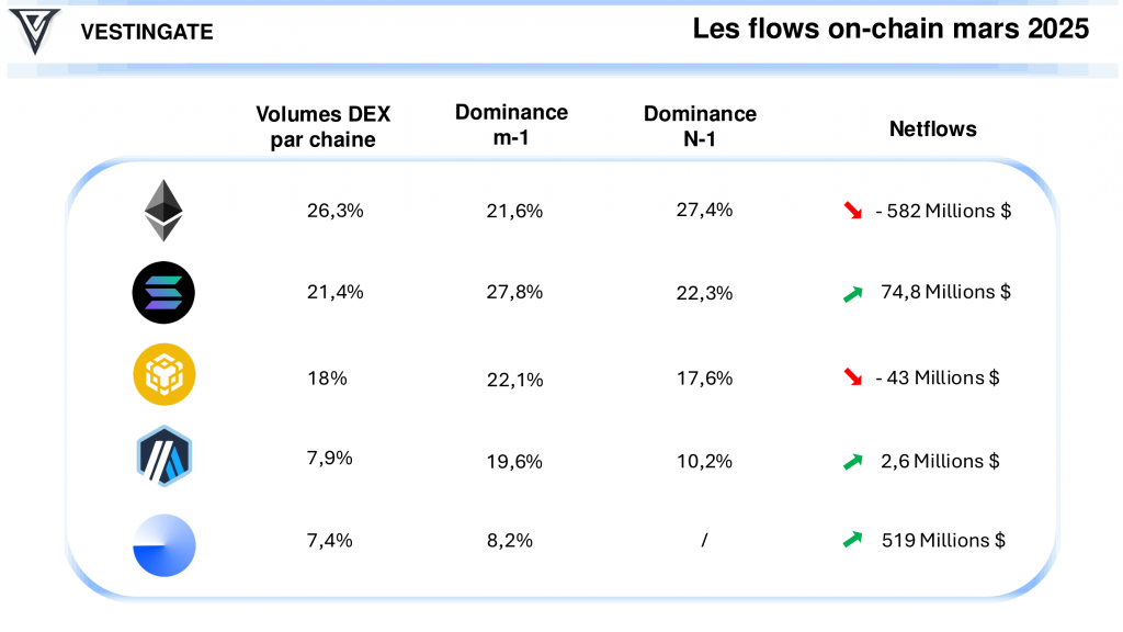 Le marché se concentre, Ethereum récupère des parts de marchés mais enregistre aussi des outflows massifs pour le compte de ses L2, selon les données de DefiLlama. Au mois de février c’est Arbitrum qui a été attractif. Aujourd’hui, c’est Base qui enregistre des netflows positifs avec 519 millions de $. Solana continue d’attirer des liquidités mais les volumes d’échanges baissent et ses parts de marchés également.