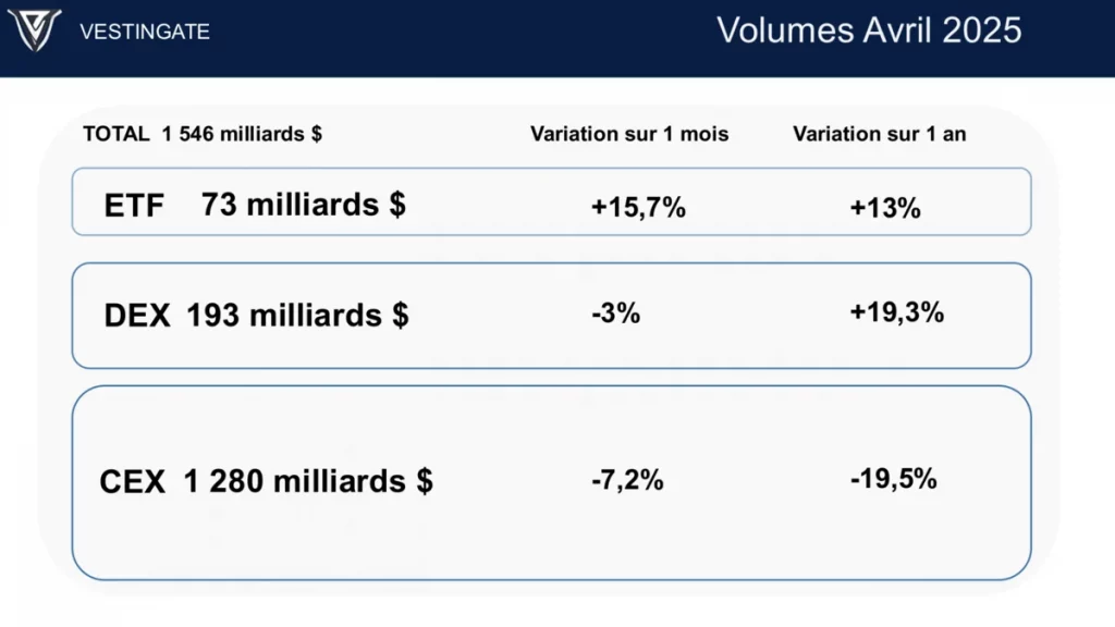 Les volumes des CEX sont en baisse de 7,2% sur le mois d’avril et de 19,5% par rapport à avril 2024. Cette baisse des volumes reflète le désintérêt des particuliers pour cette période baissière du marché.