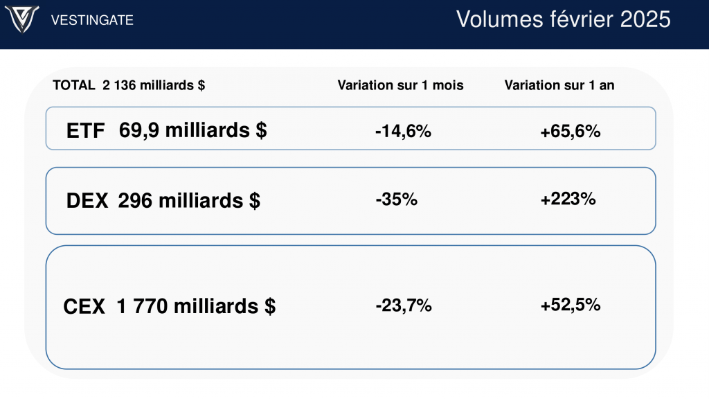 Après la baisse du mois de janvier, les volumes crypto poursuivent leur baisse au cours du mois de février 2025.