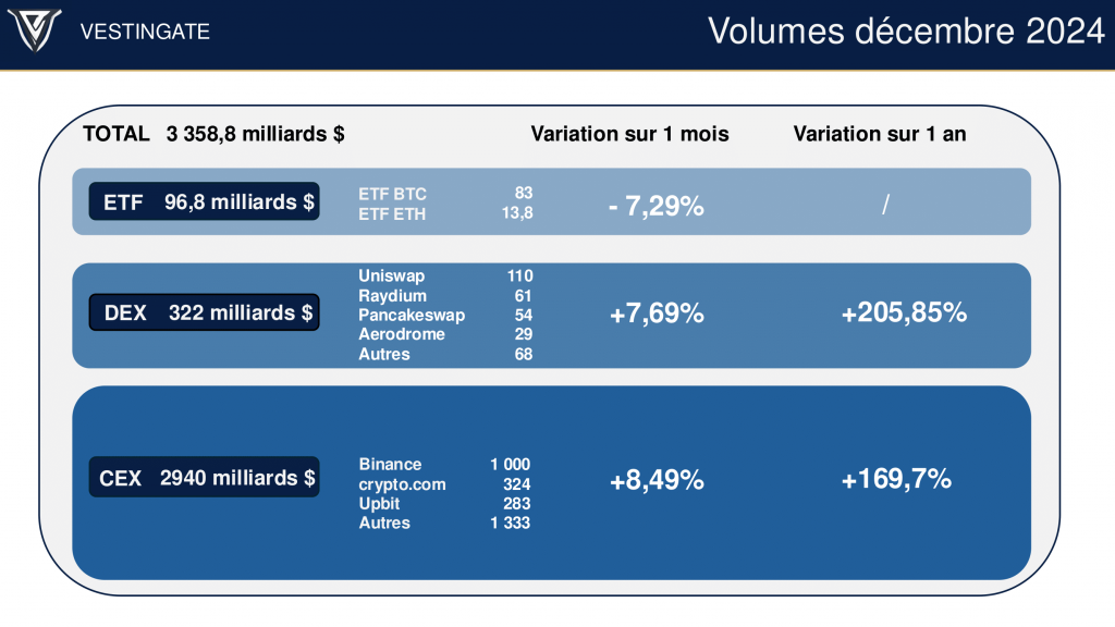 Les volumes crypto de décembre 2024 ont poursuivi leur hausse pendant cette fin d’année 2024. Ils ont augmenté de 7,87% sur la période pour atteindre 3 358,8 milliards $.