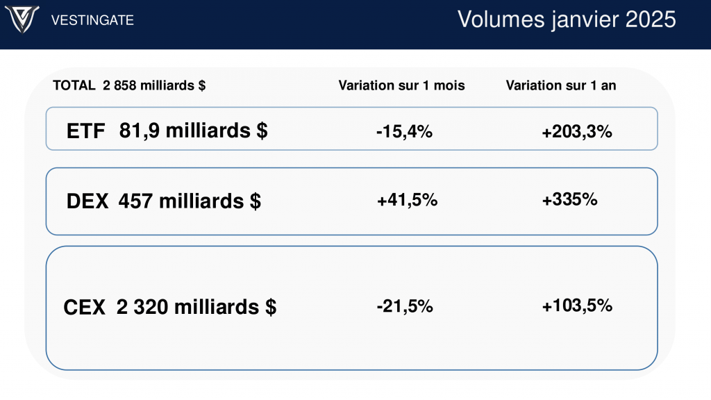 Les volumes crypto ont reculé en janvier 2025 de 14,58% pour un total de 2 858 milliards de $.